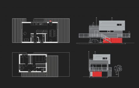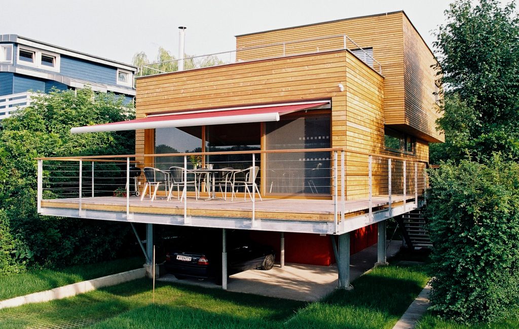 Die durch die Lage im Hochwassergebiet der Donau bedingte, aufgeständerte Bauweise und große ausladende Terrassen prägen den schwebenden Charakter der neuen Badehütte, die an Stelle einer alten Hütte aus Familienbesitz tritt. Das Wohndeck und die aufgesetzte Schlafbox gliedern das Haus, Innen wie Außen. Durch das Ineinanderschieben der Ebenen entstehen unterschiedliche, den Funktionen entsprechende Raumhöhen und -zonen. Der Baukörper wird gegliedert und im Maßstab seiner Umgebung angepasst.