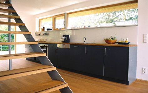 Der Wohnaum öffnet sich über große Schiebefenster auf die zwei großen, auskragenden Terrassen. Hier spielt sich im Sommer das Leben ab, man wechselt schwellenlos zwischen Innen und Außen, zwischen Garten- und Wasserseite. Im Gegensatz zum offenen Wohngeschoß, bietet die Schlafbox die Möglichkeit sich zum oder Arbeiten zurückzuziehen. Von dort gelangt man auch auf die Dachterrasse, von der man vor Blicken geschützt, den Sonnenuntergang über dem Wasser genießen kann.