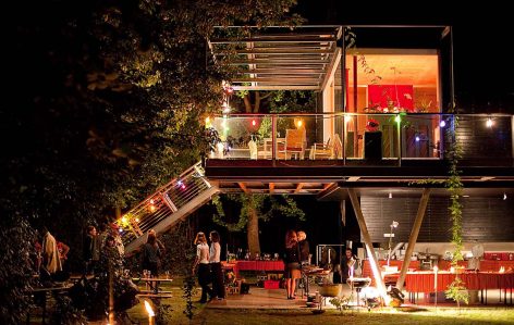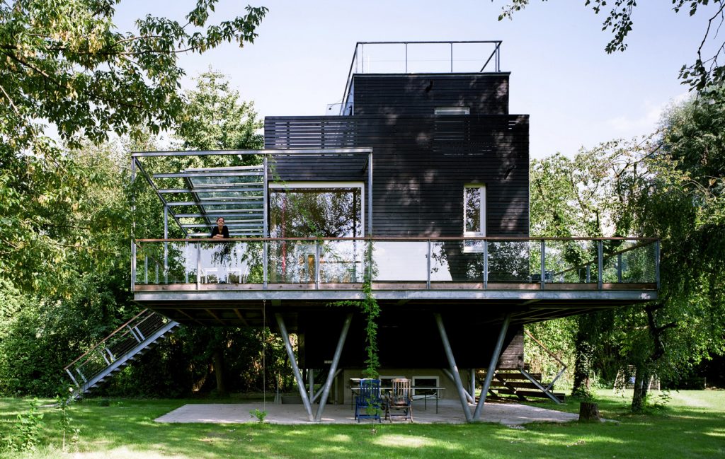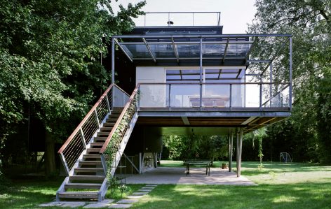 Auch bei diesem Badehaus sorgen die großzügigen Terrassen auf vier verschiedenen Ebenen für eine Erweiterung des Wohnraums im Sonner. Die Kinder gelangen über eine eigene Loggia direkt vom Garten in ihre Zimmer, die breiten Stufen dienen auch als Tribüne zum Ballspielplatz hinterm Haus. Den Wohnraum erreicht man über eine lange Freitreppe und die Hauptterasse mit Blick aufs Wasser. Vom Arbeitsbereich aus gelangt man schließlich auf die Dachterrassen von denen man einen wunderbaren Blick auf die Donau genießt.